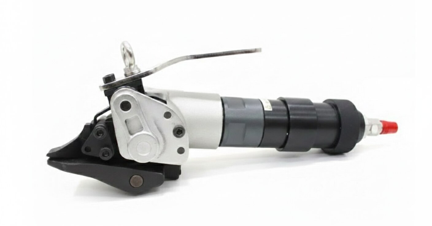 Product Overview The GP TE 19-32 is an economic-grade industrial tool designed for heavy-duty packaging and securing applications. Manufactured in China, it provides a functional solution for industrial strapping needs. Technical Specifications Model Number: GP TE 19-32. Type: Economic. Strap Material: Exclusively for use with Steel Strapping. Strap Width Compatibility: Supports 19 mm or 32 mm widths (size must be specified). Origin: Made in China. Key Features & Design Robust Construction: Features a high-strength metal body with a matte silver and charcoal grey industrial finish. Heavy-Duty Jaws: Equipped with a black steel jaw assembly designed to grip and secure steel straps under high tension. Ergonomic Handling: The tool includes a black cylindrical rear handle for steady operation. Workstation Integration: An integrated silver lifting eye on the top allows for the tool to be suspended from a balancer or overhead crane. Pneumatic/Adjustment Port: A red-capped connector is located at the rear for air intake or mechanical adjustment.